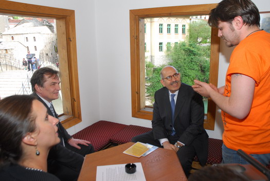 Dr. Mohamed ElBaradei, generalni direktor međunarodne Agencije za atomsku energiju (IAEA), četvrti je laureat međunarodne Nagrade za mir, koju dodjeljuje mostarski Centar za mir i multietničku saradnju. U prostorijama Centra za obuku u starogradskoj jezgri u Mostaru, u krugu brojnih zvanica, aktivista i prijatelja, visoko priznanje, dr. ElBaradeiu uručio je dr. Haris Silajdžić, predsjedavajući Predsjedništva BiH, koji je i počasni predsjednik mostarskog Centra za mir. Dr. Silajdžić je istakao da mu je velika čast što je danas među Mostarcima da i na ovaj način promoviramo Centar za mir i multietničku saradnju. „Posebno me čini srećnim – kazao je Silajdžić, što međunarodna nagrada za mir ide u ruke dr. ElBaradeia, istinskog pobornika mira, pomirenja, solidarnosti među ljudima i zemljama koji se potvrdio i kao istinski prijatelj države Bosne i Hercegovine.“